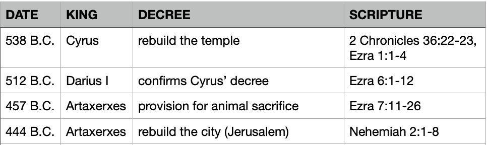 The 69 week period (of 7 weeks and 62 weeks) begins with the issuing of the command to rebuild Jerusalem, and the period ends with the anointed prince (Messiah) arriving. There are four historical decrees recorded in scripture concerning the rebuilding of Jerusalem. 1) Cyrus decree to rebuild the temple was in 538 B.C. (see 2 Chronicles 36:22-23 and Ezra 1:1-4). 2) King Darius I confirms Cyrus’ decree in 512 B.C. (see Ezra 6:1-12). 3) Artaxerxes’ decree in 457 B.C. makes provisions for animal sacrifices (see Ezra 7:11-26). 4) The final decree was Artaxerxes authorizing Nehemiah to rebuild the city of Jerusalem in 444 B.C. (see Nehemiah 2:1-8).